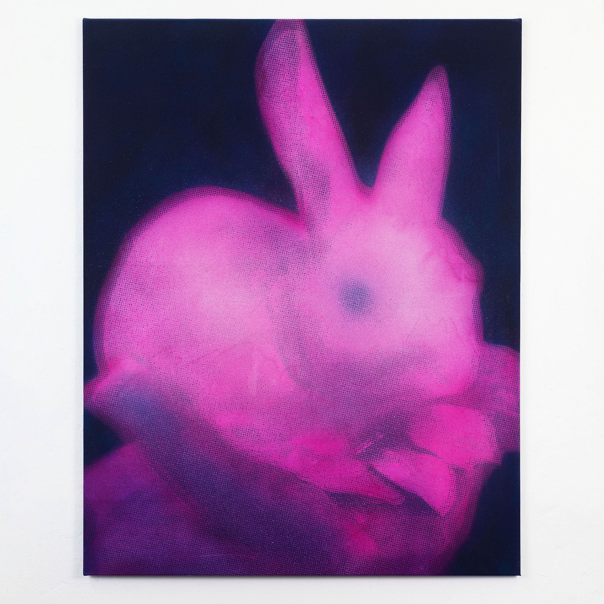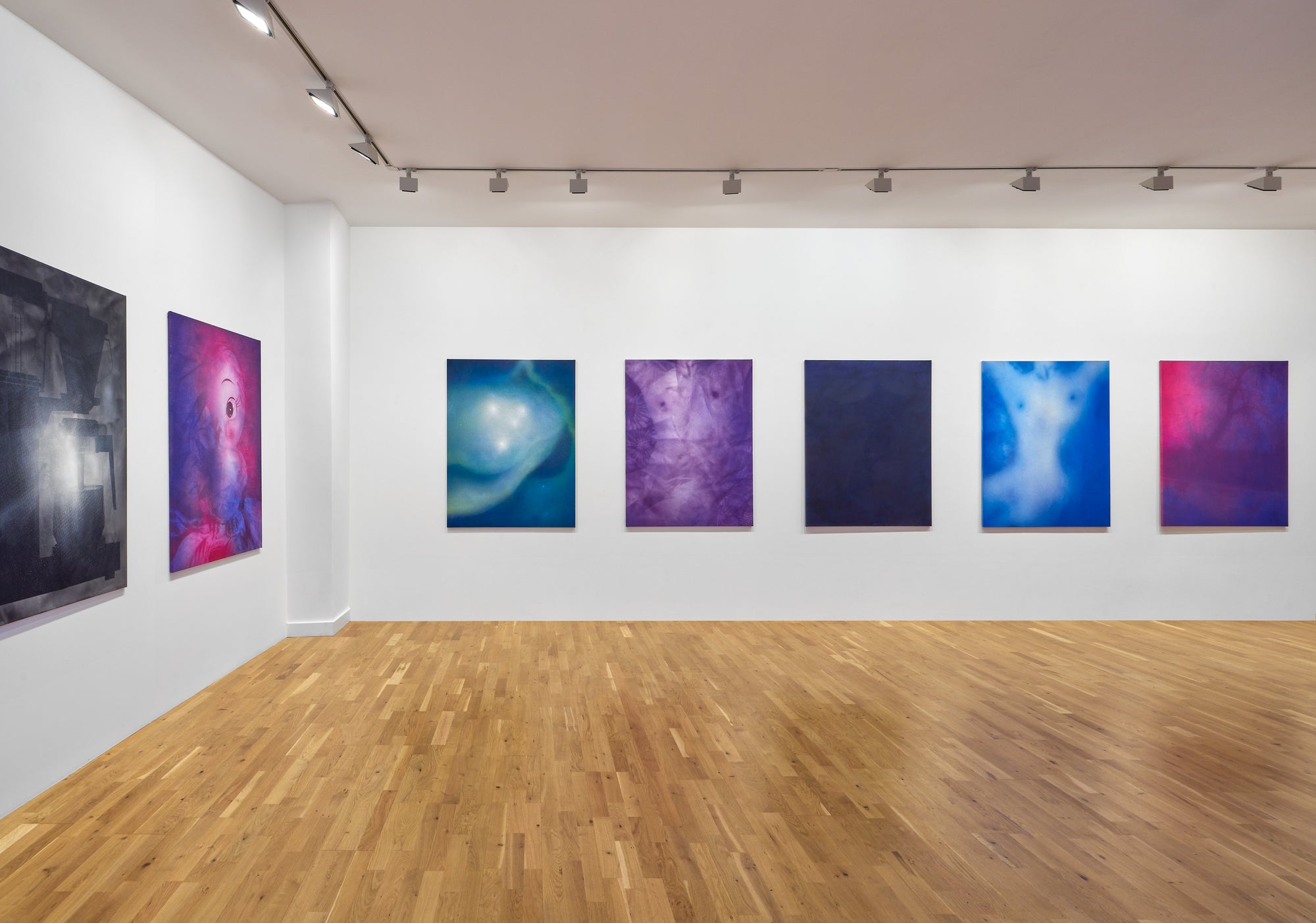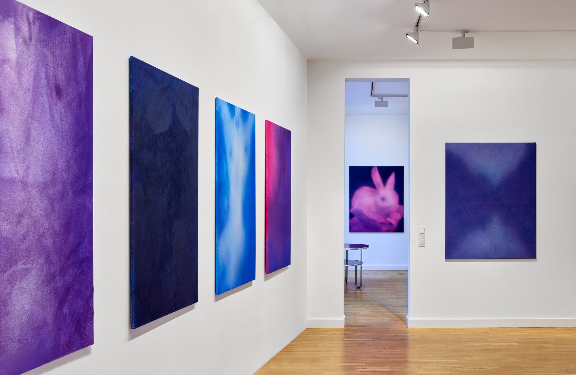 "Conceptual Romance," Anders Kjellesvik's third solo show at Michael Janssen, delves into the intricacies of communication between painting and photography on both technical and metaphysical levels. Figurative elements materialize through multiple layers of grainy prints, as if in an analogue film, but the image, never fully developed, remains concealed in the translucent shades of oneiric abstractions. The fragmented, dream-like nature of Kjellesvik’s paintings is reminiscent of a hazy memory that evokes a sense of otherworldly nostalgia. However, the otherwise autonomous depictions of human bodies, animals, and trees are unified by a hypnotic color palette of cool, electric purples, blues, and greens, infusing the artworks with mystical sensuality.
