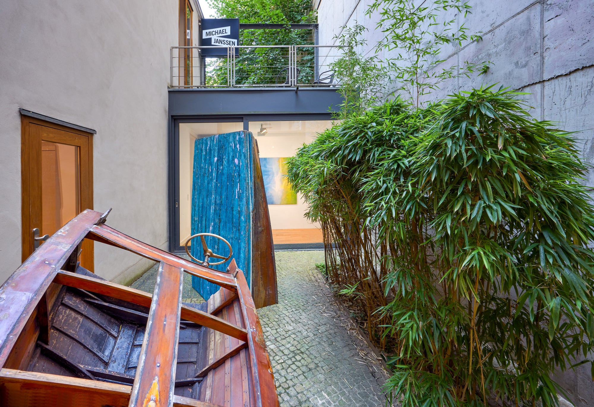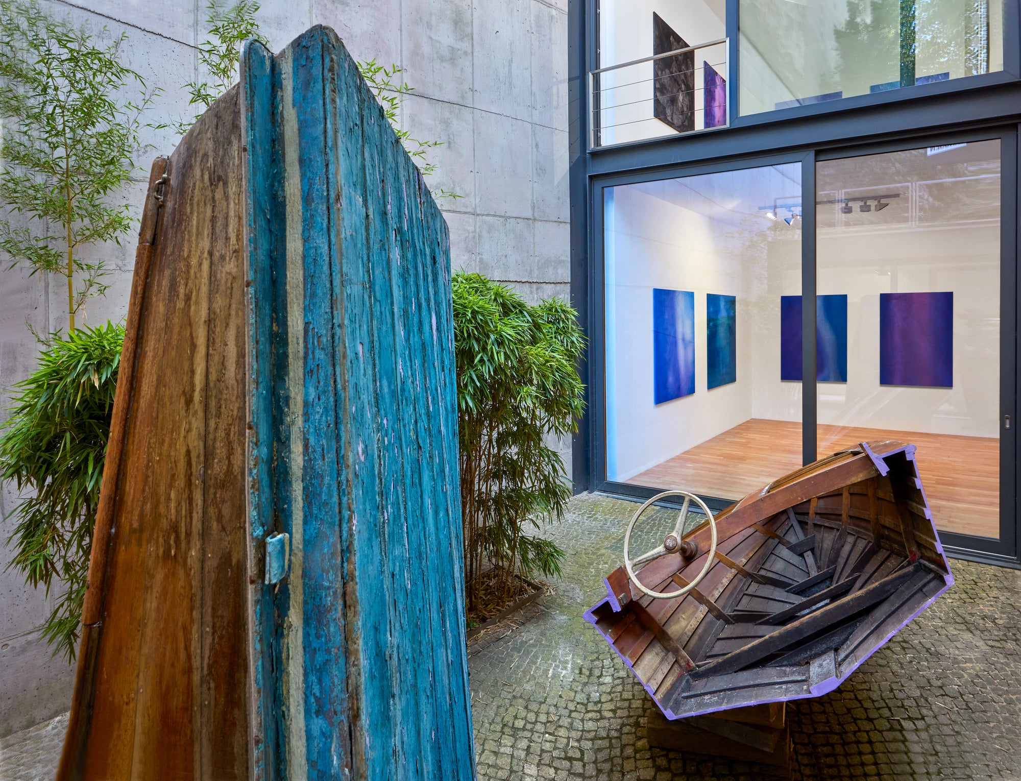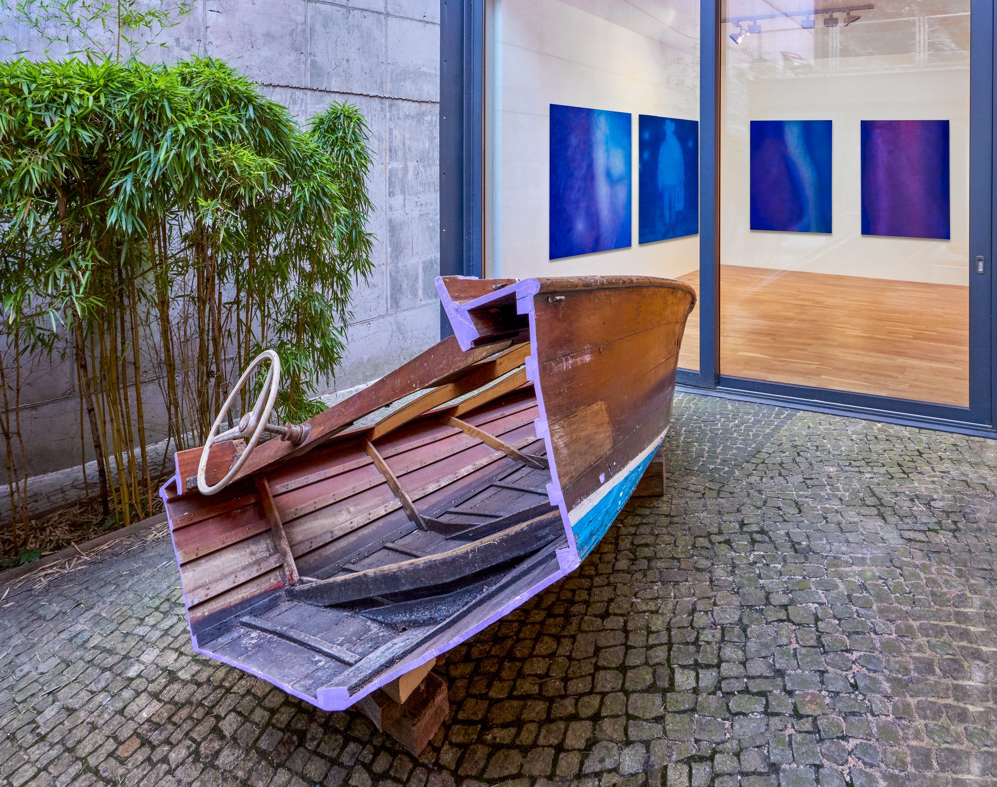These ethereal, richly textured paintings, which invite viewers on a transcendental pictorial journey, are inspired by the worldly expeditions that Kjellesvik has been organizing for the past 20 years alongside fellow Norwegian artist Andreas Siqueland, as part of their collaborative travel-art project called "aiPotu" (the word “utopia” spelled backwards). During their travels, Kjellesvik and Siqueland playfully engage with their surroundings, using temporary interventions as a form of social practice. Together the artists built a public shower in an Irish brook, erected a monument to honor unrepresented nomadic groups in a small Norwegian community, and floated along the shores of lake Mjøsa inside a giant potato sculpture. Their whimsical experiments rebel against standardized, capitalist forms of art creation, favoring community-oriented, site-specific acts carried out within natural settings.