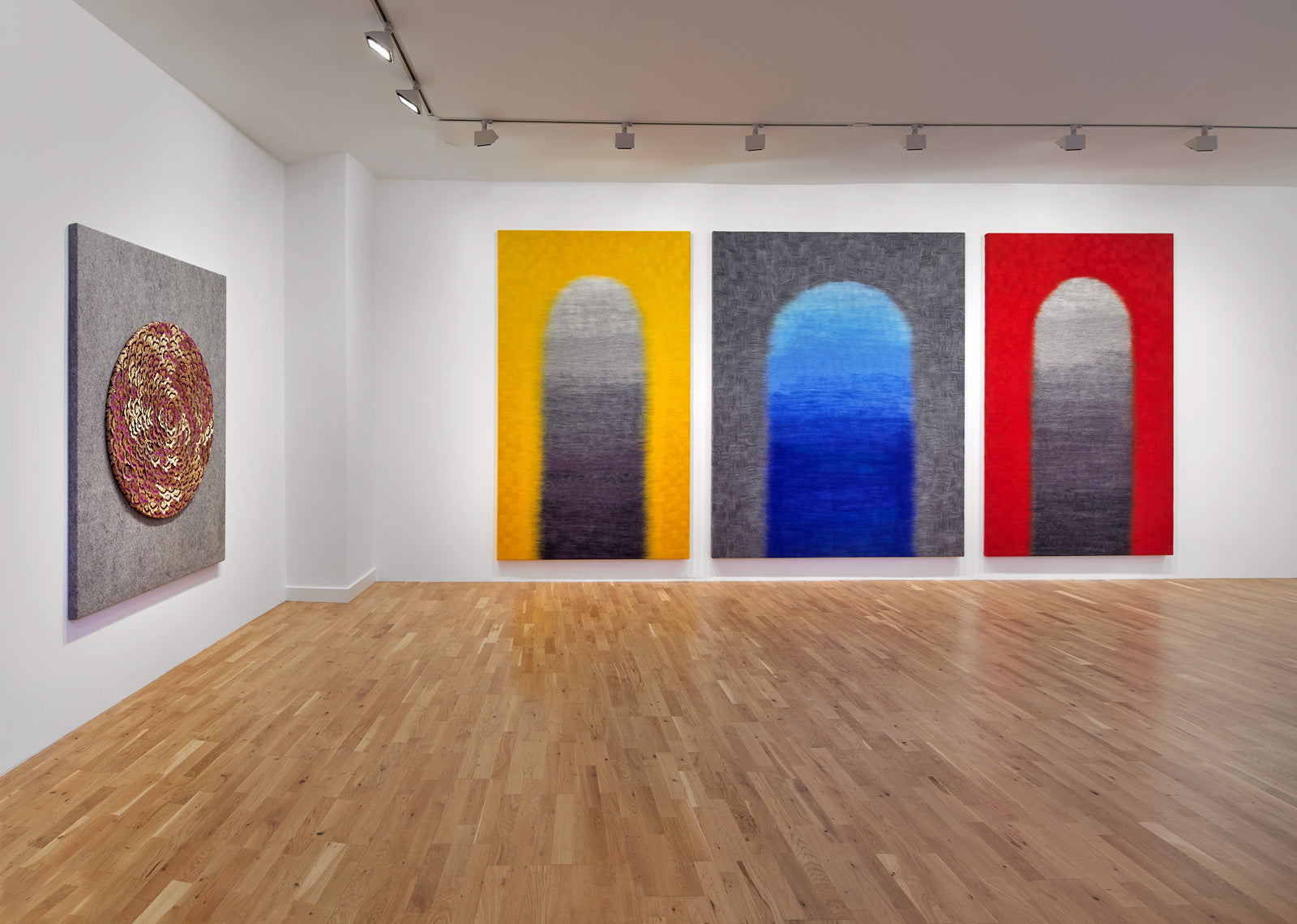 The series Post-Nomadic Reality that features in “Un-Conscious” is informed by the traditional tuskyiz, hand embroidered wall carpets that typically are ornamentally patterned. Mukazhanova breaks apart this word to get at its essential meaning: tus to dream and kyiz to felt. Like portals or screens, Mukazhanova’s works in this series invite the viewer to dream of another world where hopes and desires can be sublimated into the unconscious, but also create a space where new identities can be assumed. This is further punctuated in Mukazhanova’s triptych, Untitled (2021), where three large-scale felted paintings contain curved windows. The felted materials of gray, red, and yellow, however, give the image plane a surreal quality where reality and fantasy can merge. Though the tryptic might be reminiscent of the celestial and historically used to narrate linearly, it is transformed beyond recognition while retaining its referent to the divine.