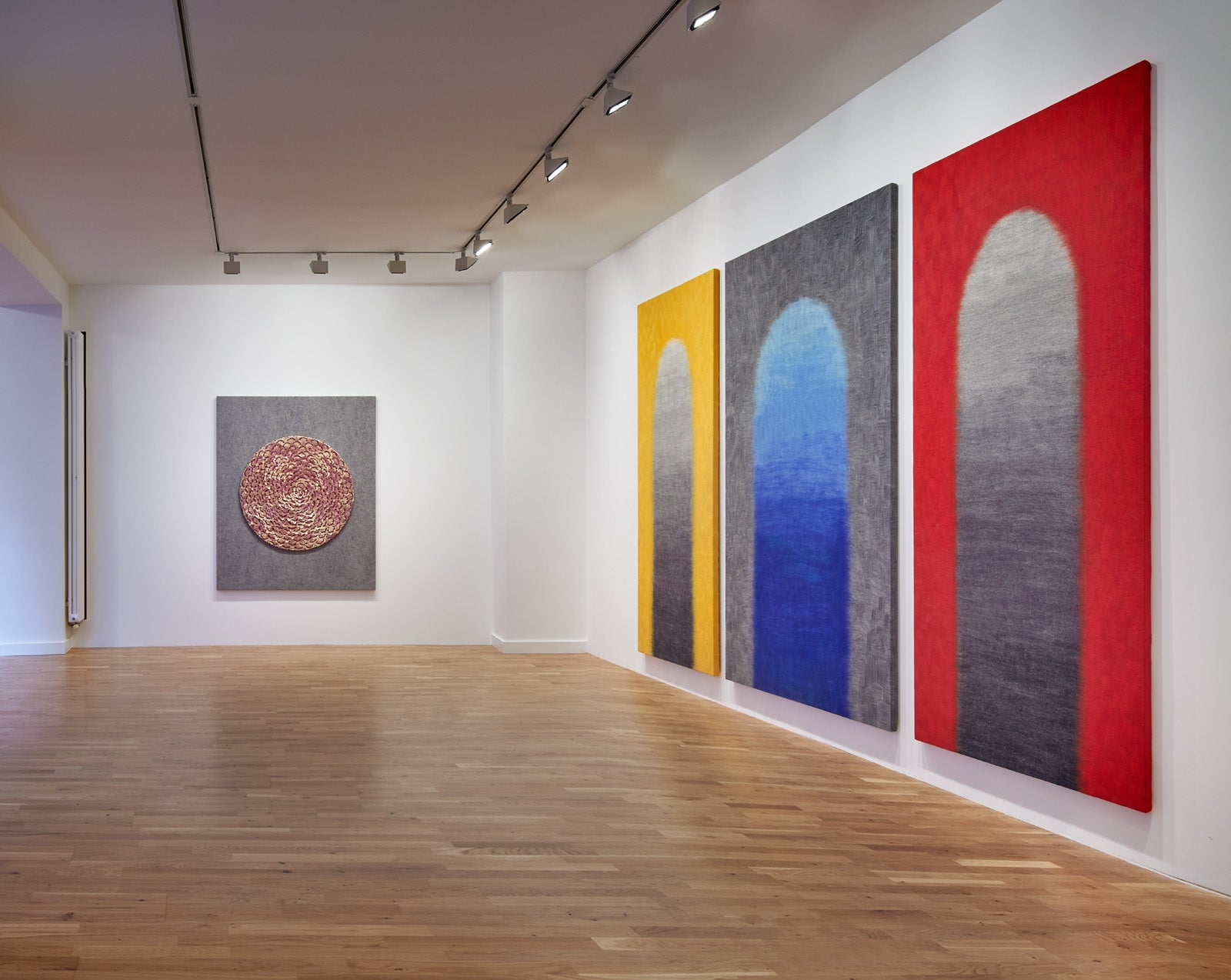 Central to the artist’s practice is research into and a processing of Kazakh society, where the artist experienced the Soviet collapse and subsequent capitalist embrace as two abrupt transitions and migrating orders. Since emigrating to Berlin, the artist has honed her observation on post-nomadic identities. Though the term “nomad” today is often used in reference to the digital nomad living in alienation or isolation from communities, the artist’s oeuvre grasps the tension between the rooted and unrooted by observing visual practices developed in nomadic communities in Kazakhstan. Here, the digital and the traditional are held in tight balance within the artist’s works, where she takes up ancestral felting techniques that are practiced within the region. Mukazhanova instead ushers these techniques into the language of minimalism where large-scale, monochrome oranges and mustards point to a period that sought to throw-off the archaic and elude figuration. The felt recalls the performative practices of the mid-20th century, German artist Joseph Beuys, who famously employed materials such as fat, felt, sauerkraut, and honey by pairing them down to their essential elements for profound contemplation. Mukazhanova’s works similarly tap into subconscious processes by selecting significant cultural materials, such as felt or carpets, yet presents them with new, unconventional methodology.