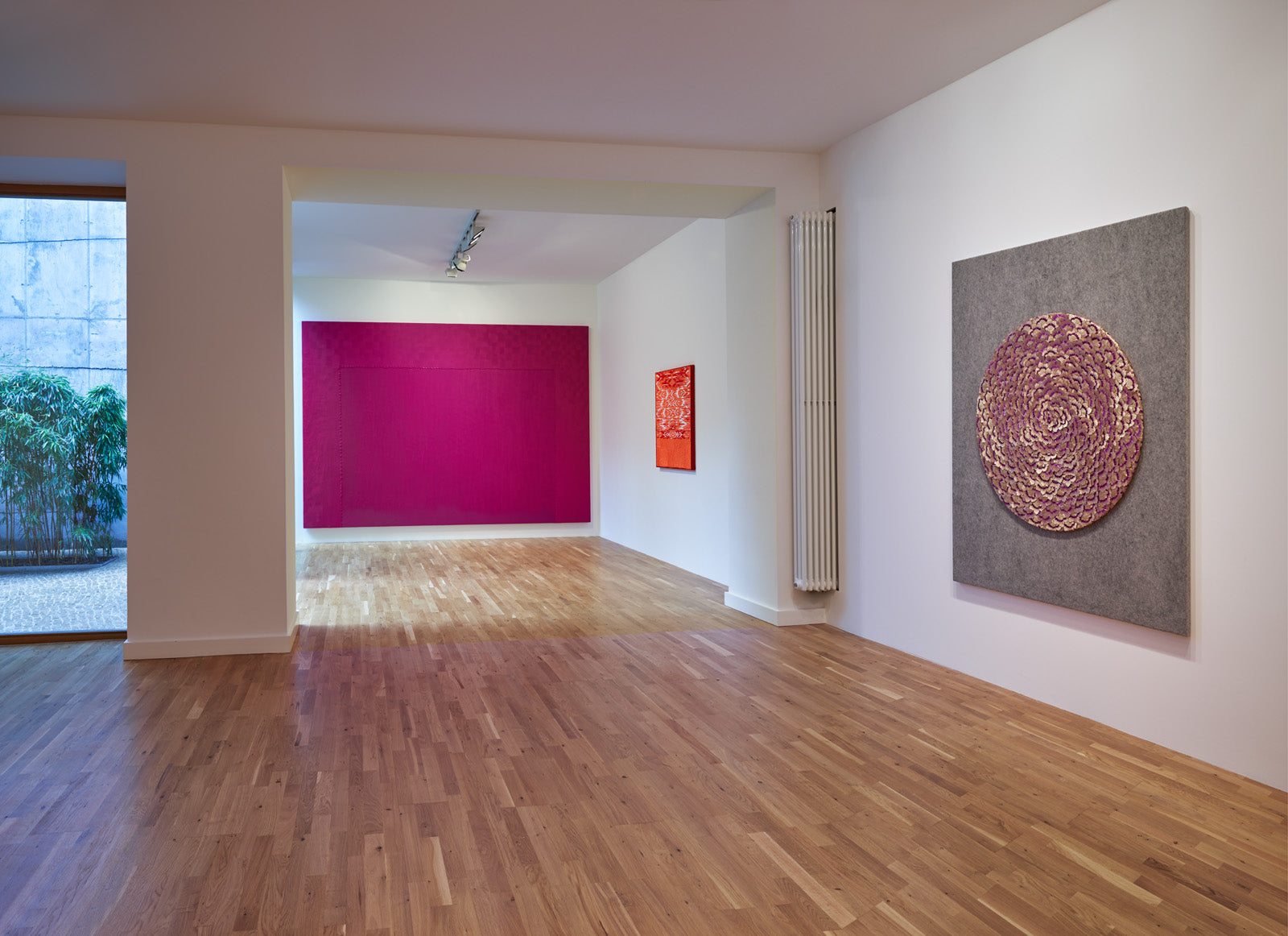 Fabrics of silk and velour stretch tautly over canvases, luring the viewer into Gulnur Mukazhanova’s solo show with Galerie Michael Janssen. Titled “Un-Conscious,” the exhibition will be the artist’s first showing with the gallery to date where the artist will present a series of felt paintings and collages, both of which are produced exclusively for the exhibition. “Un-Conscious” offers a survey into the artist’s almost decade long inquiry into post-nomadic identities. The works together explore how felt and collage can become a conduit to subvert ancient practices and visuals that remain in circulation and likewise to meditate on cultures in flux through employing the language of abstraction.