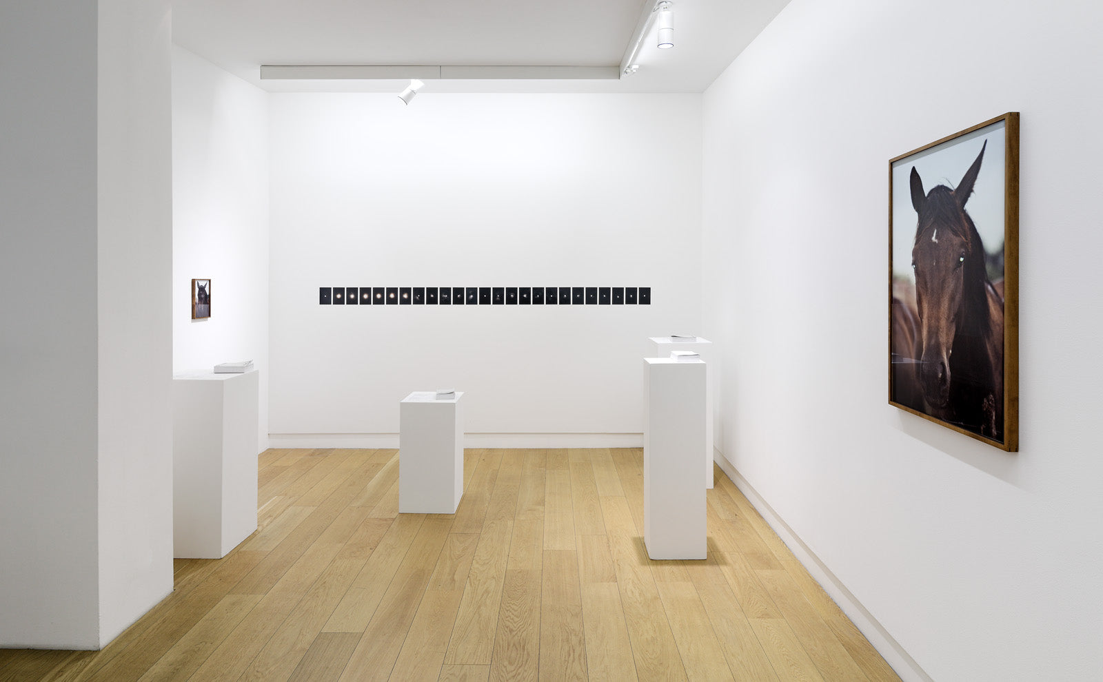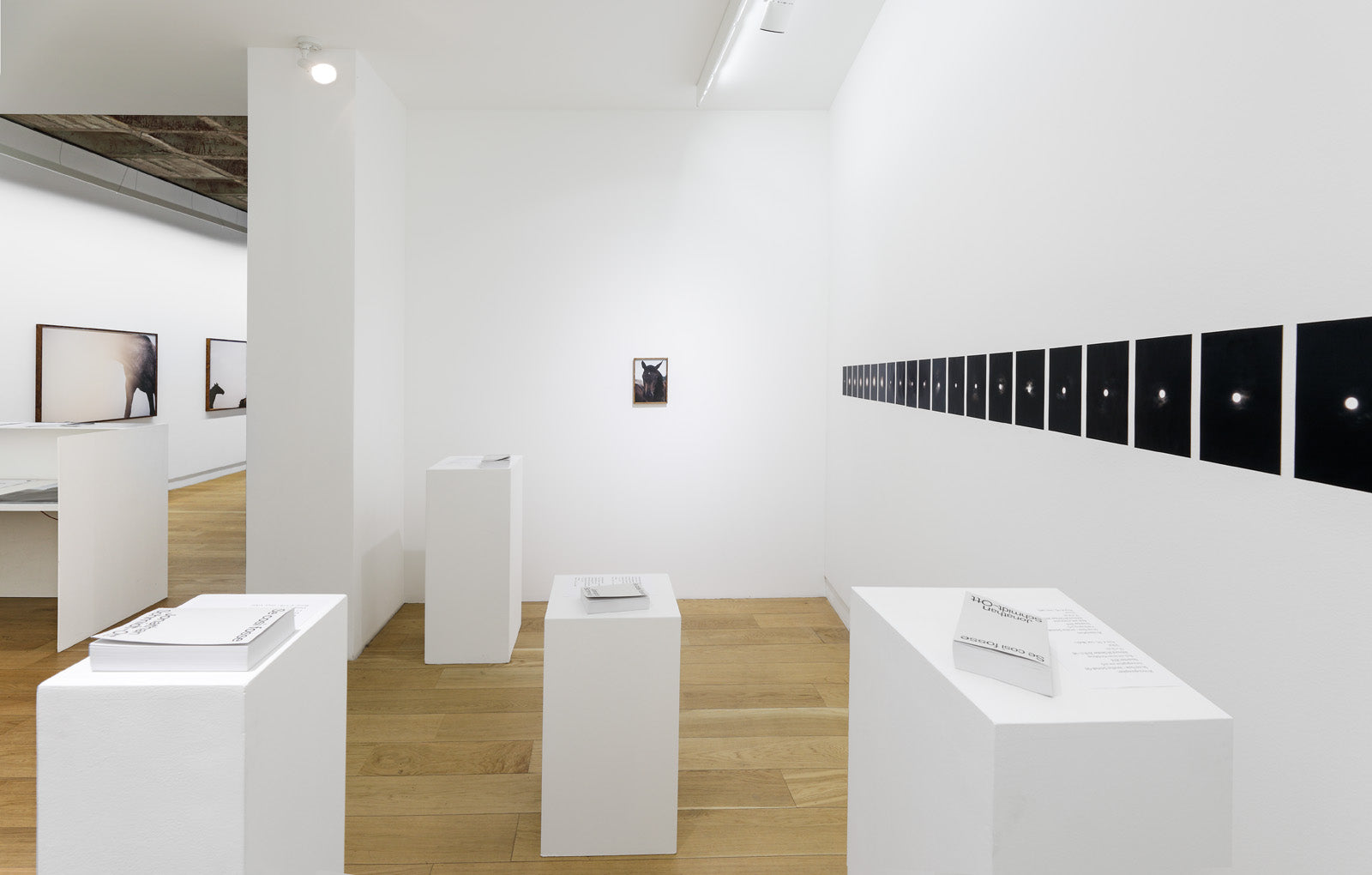 ~Vollmond contains one image formatted unlike the rest: a vertically-oriented portrait taken at close range with a flash. The light burst is reflected in the horse’s glassy eyes as a luminous glow. At first, the reflection appears white—an approximate moon—but closer inspection reveals the visible spectrum. Its iridescence stands for all the richness of human perception, as well as the limited scope of what we can perceive.