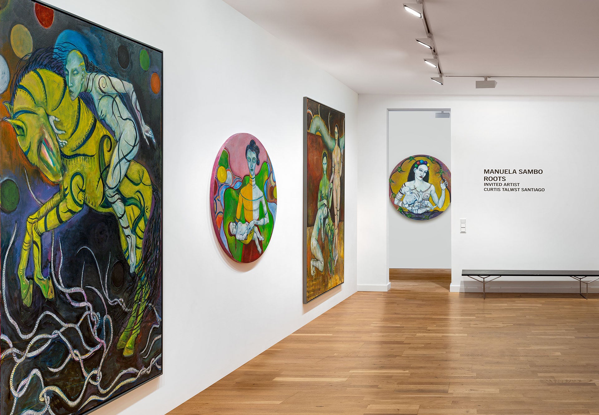 The paintings in the exhibition extend this discourse into a distinctly painterly pictorial space. Works such as “I Hope you Remember”, “Il Bambolo”, “Casa das Tintas”, “Kahala”, among others (2020–2026), engage with creation and destruction, consciousness and the unconscious, dissolution and redemption. Particularly striking is the tondo “Wake Up, Child!” (2026), which references the Angolan wartime period and depicts a gender-ambiguous figure cradling a child. The image condenses existential ambivalences of life and death, responsibility, powerlessness, and individual agency within repressive systems into a powerful icon.