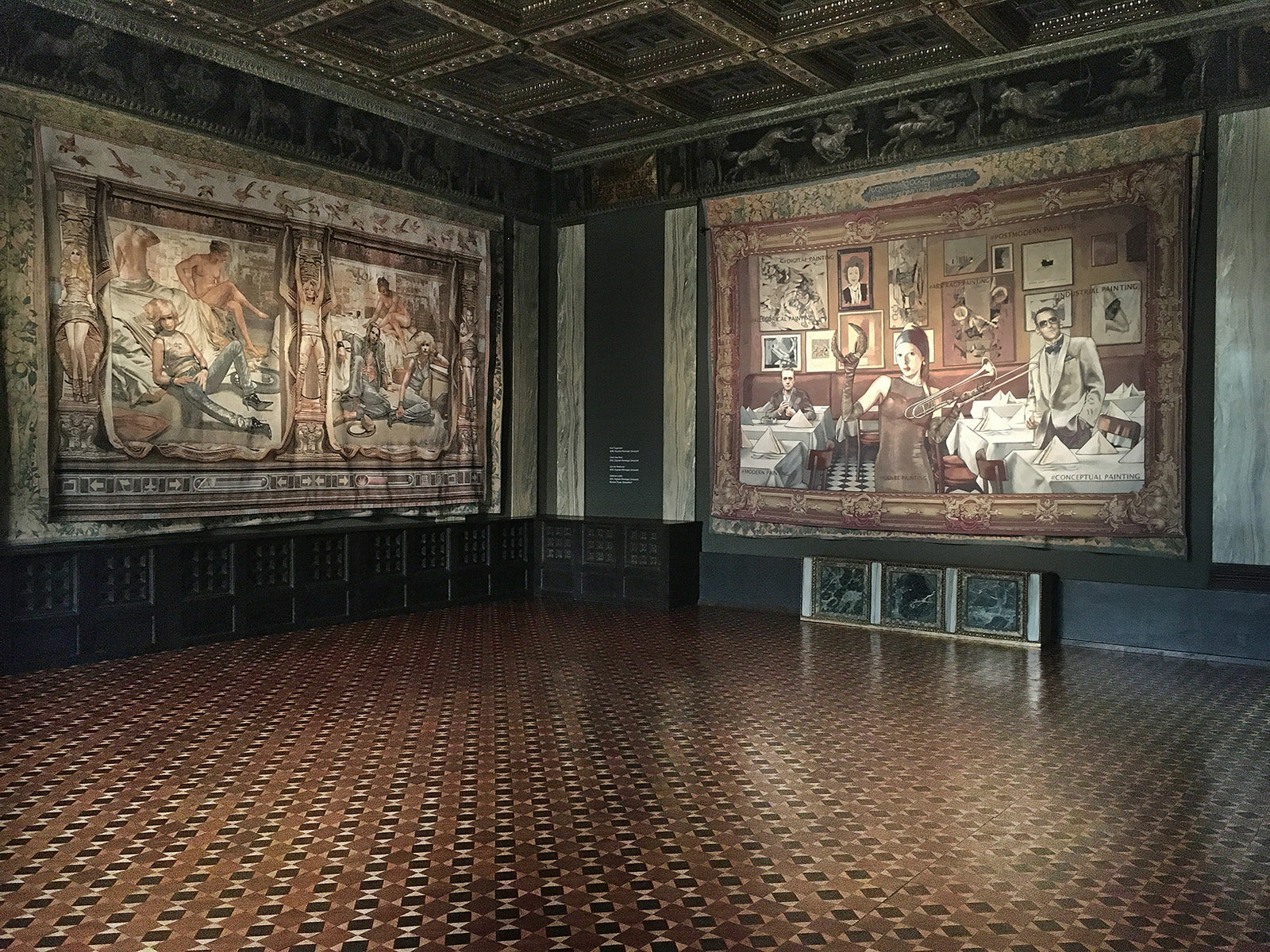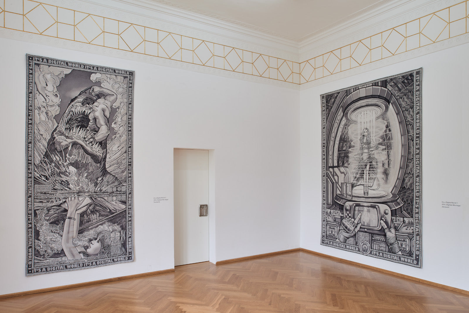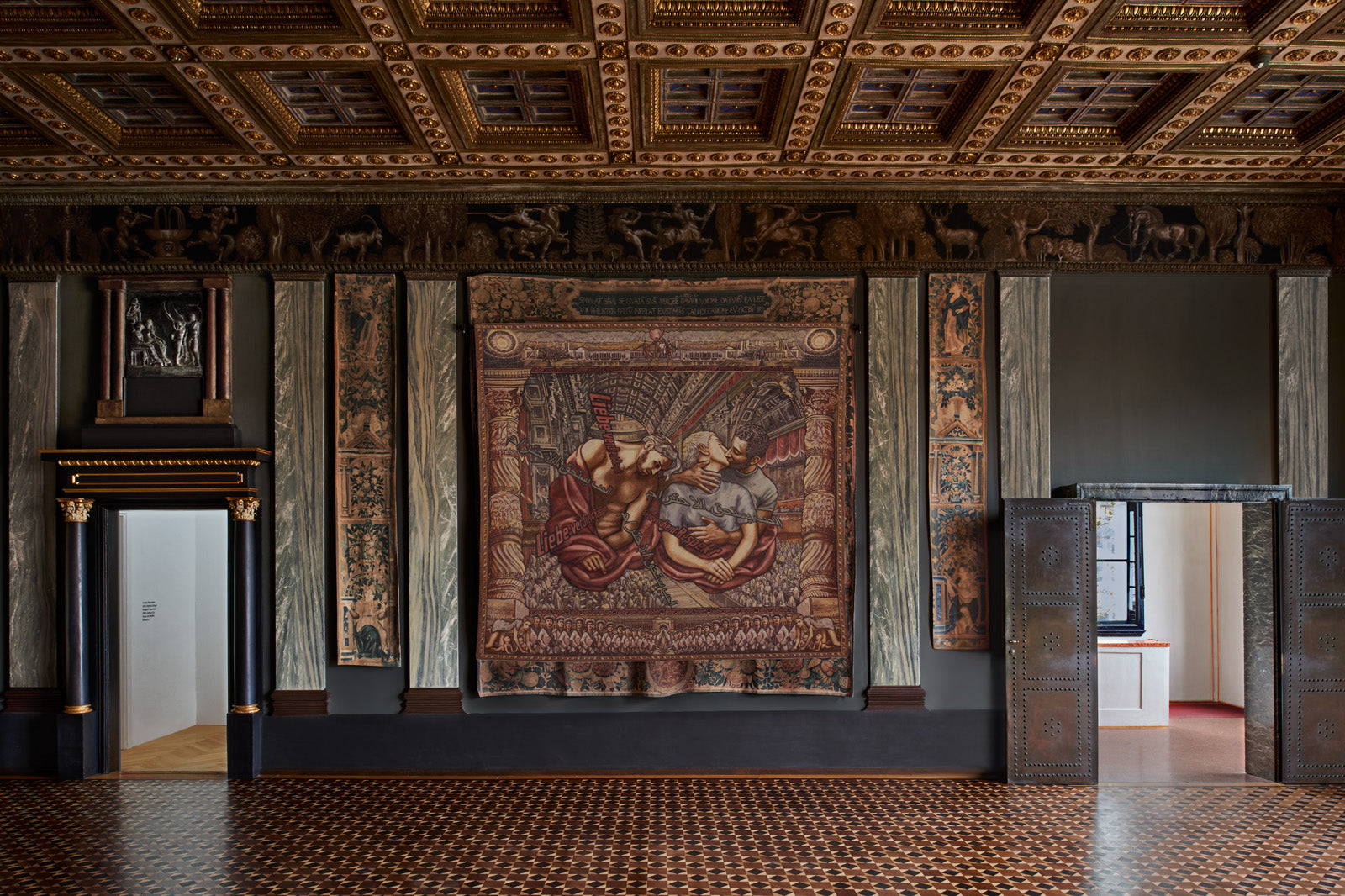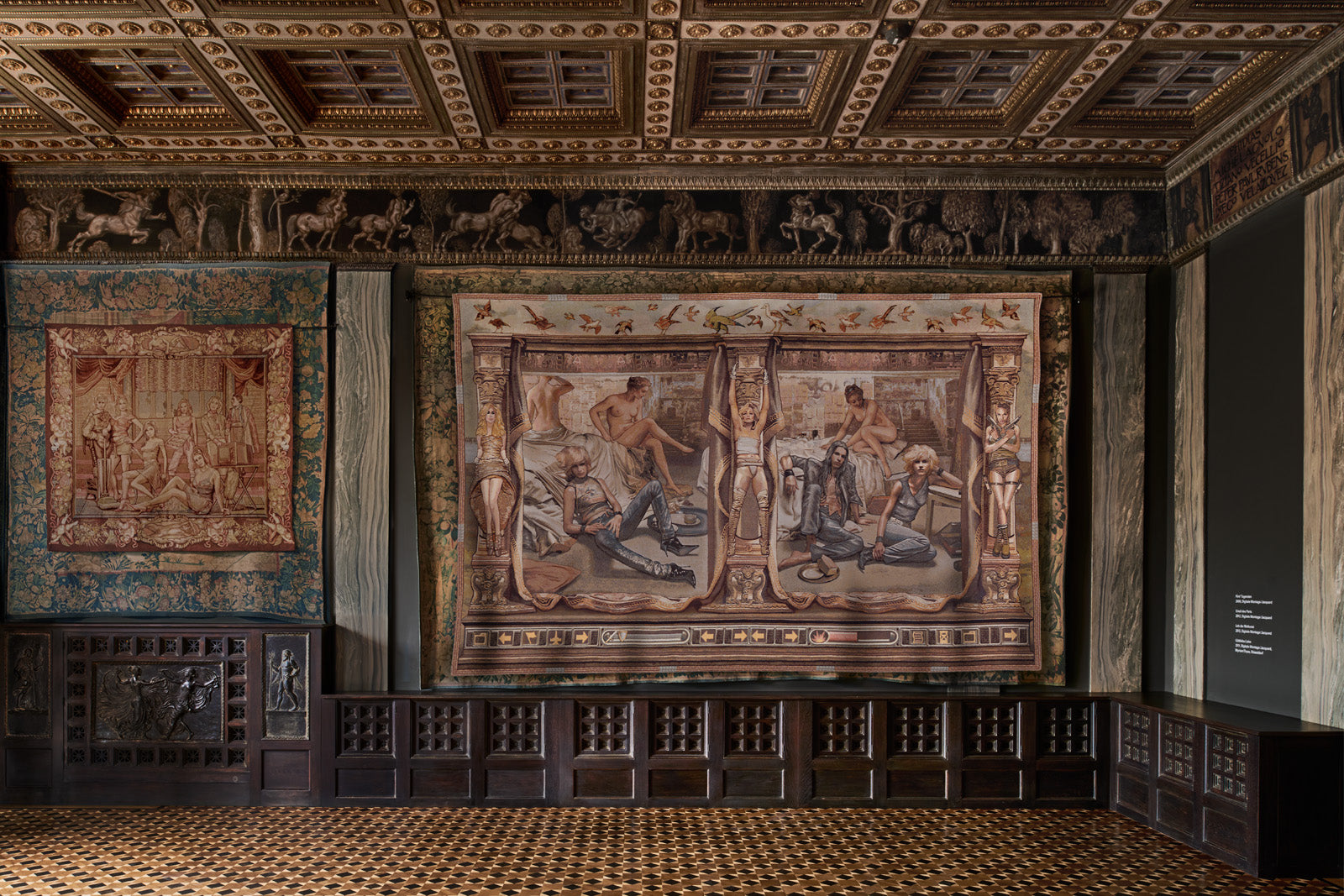 The exhibition MARGRET EICHER. LOB DER MALKUNST extends over the second floor of Franz von Stuck's historic artist villa. Beginning in his former artist's studio and later representation and sales room - where they are installed in front of the Brussels tapestries that are part of the room's original furnishings - Eicher's works cast the artist prince's former living quarters in a new light by rediscovering myth as a form of social communication.