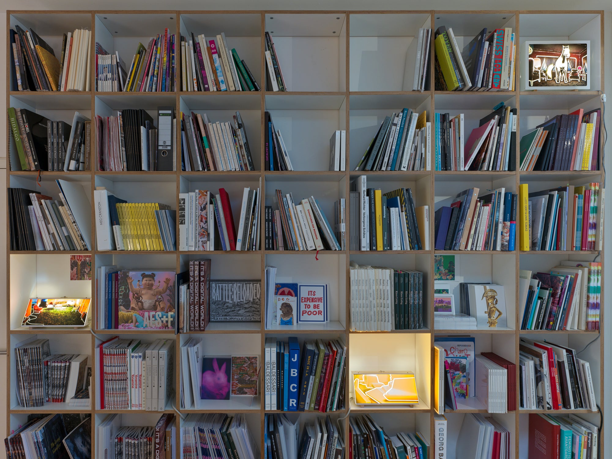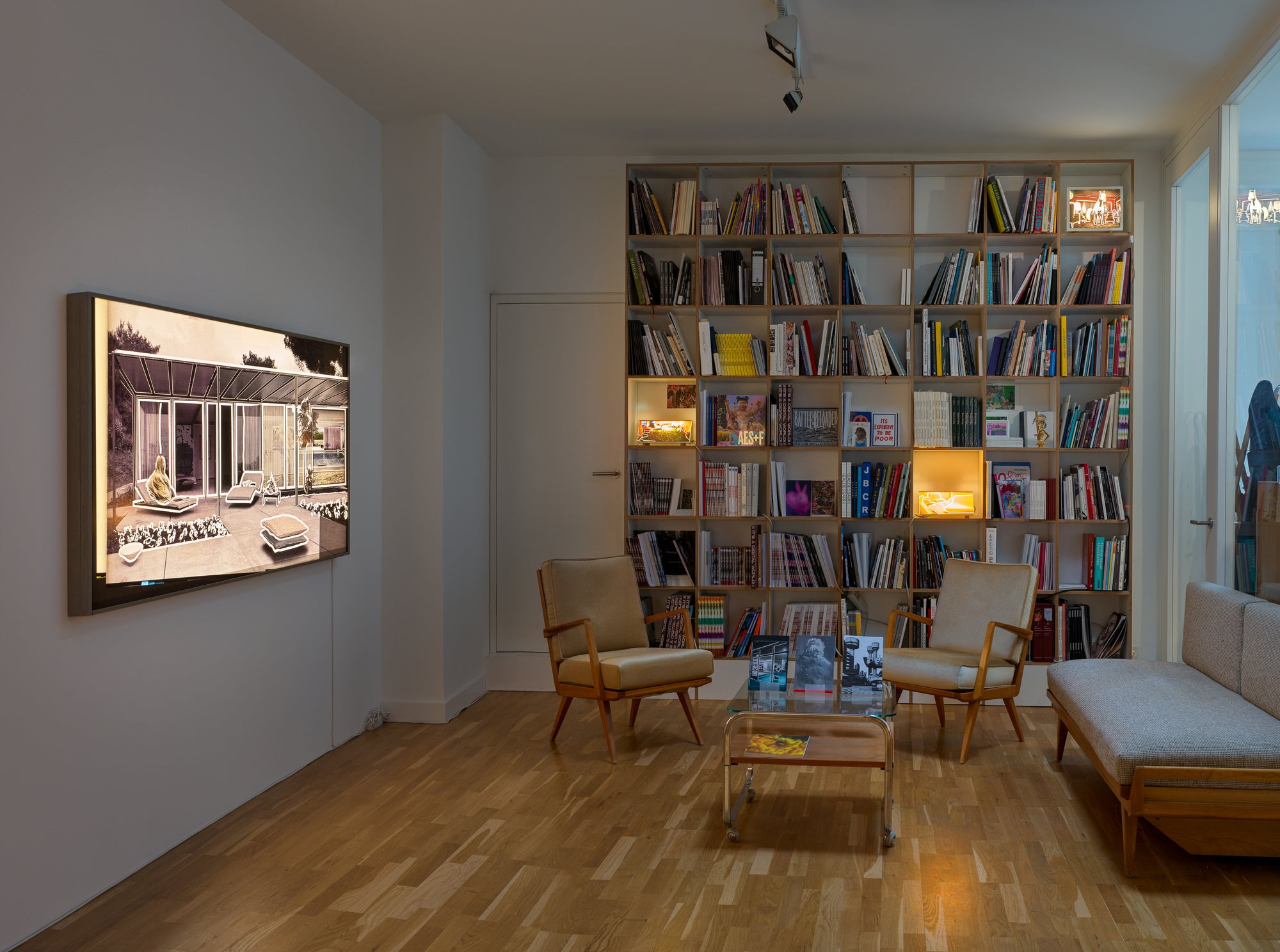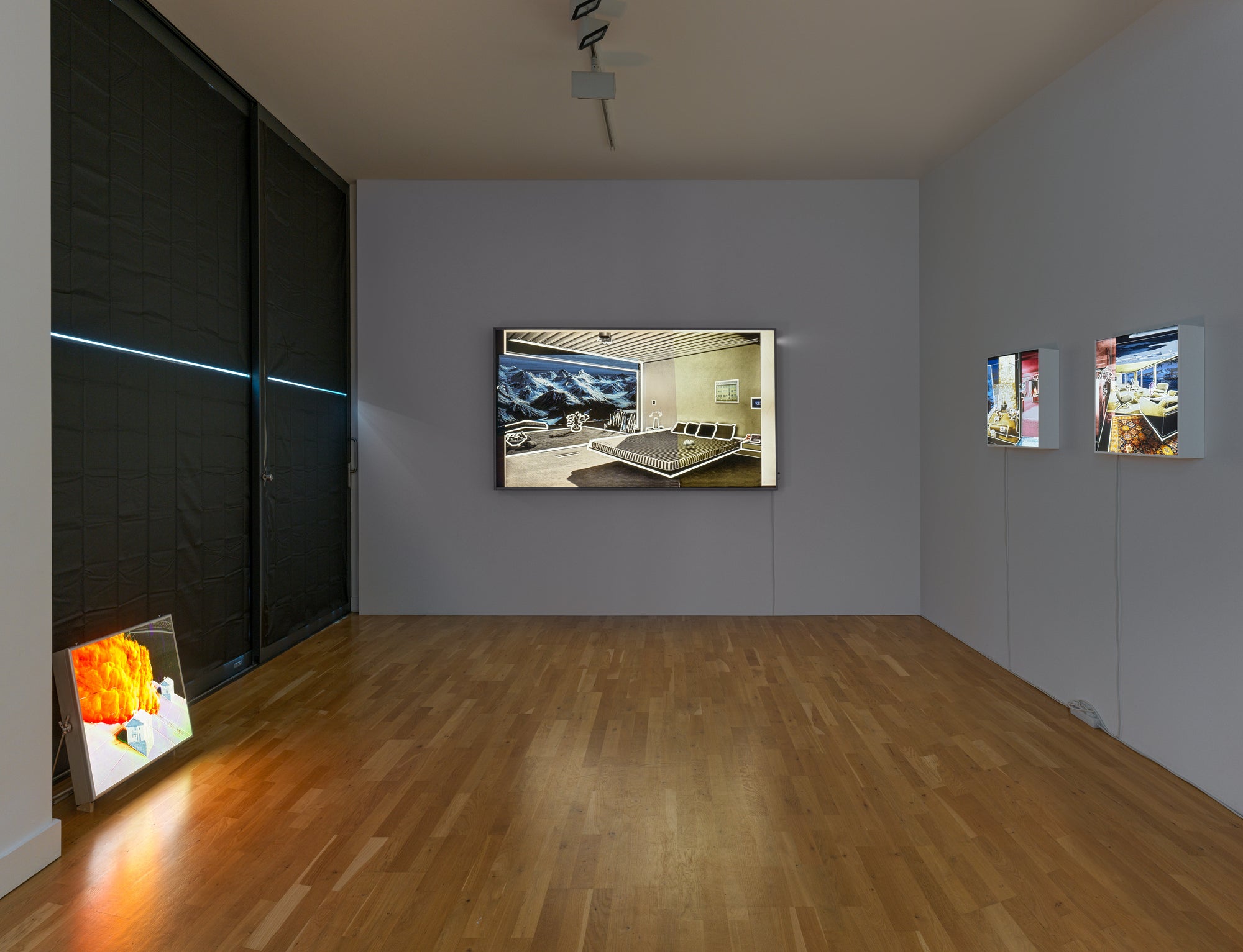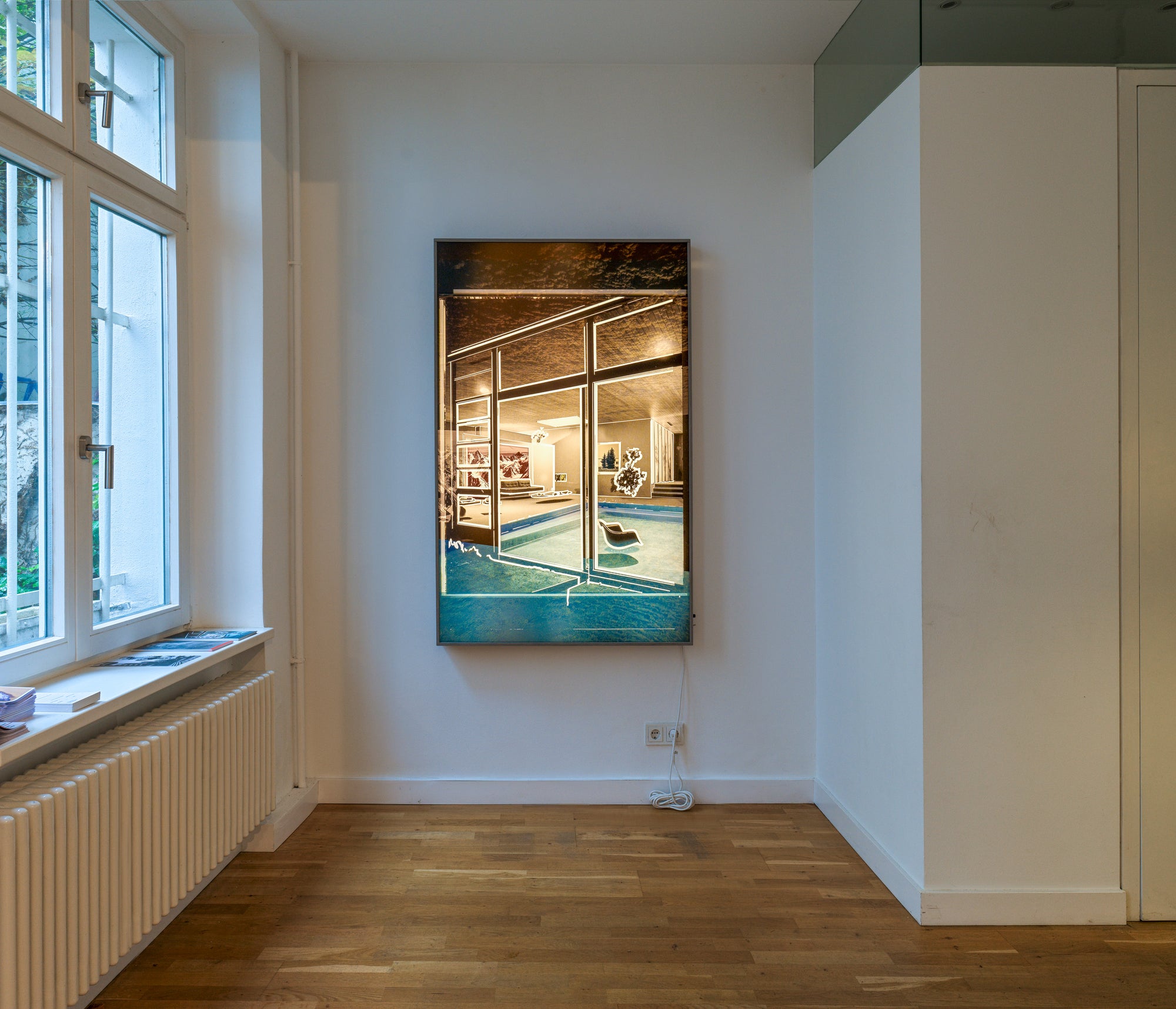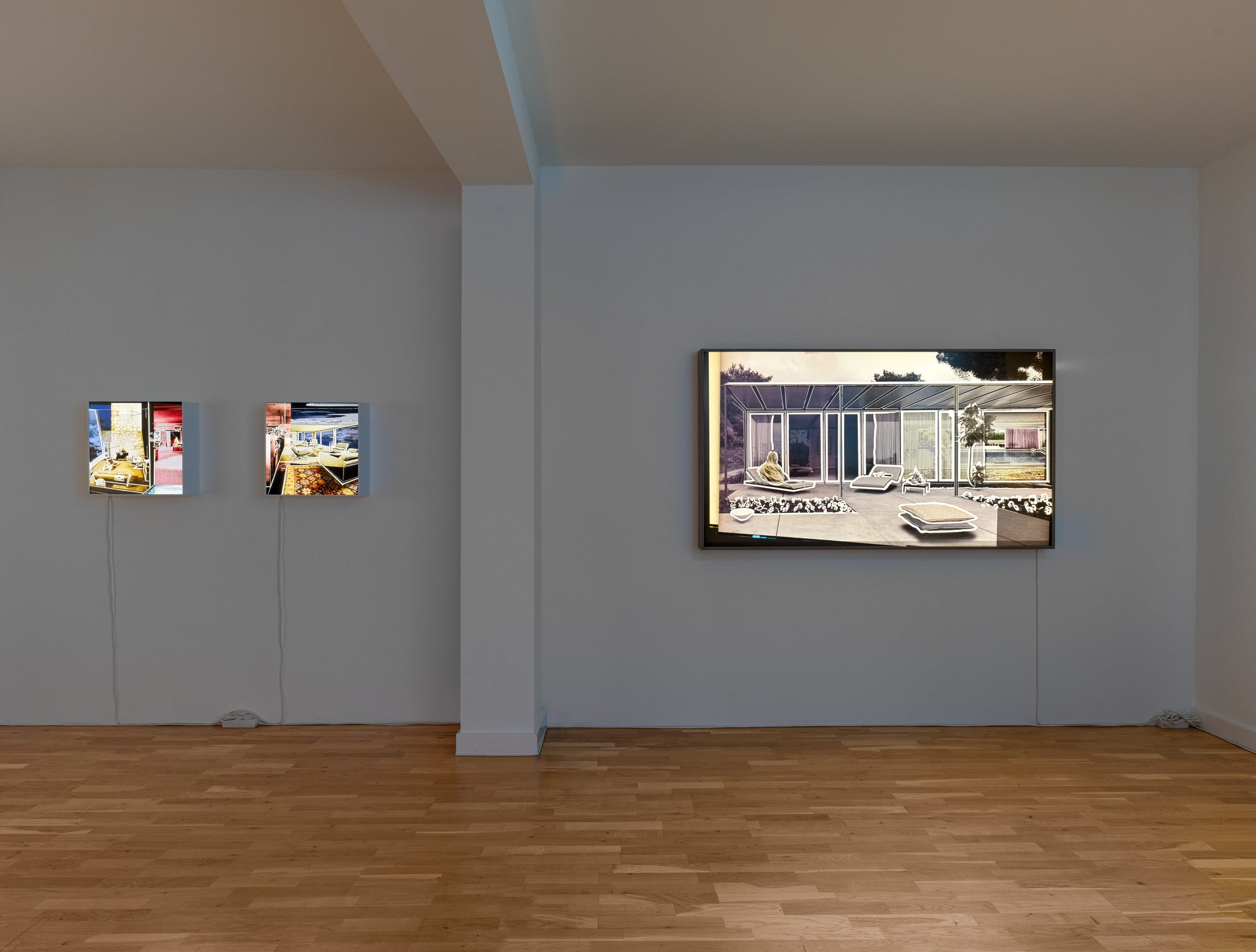 In dialogue with the multidimensional spatiality of his twin brother, Torsten Ruehle uses line and light to create a different kind of atmosphere. His illuminated boxes project domestic settings emptied of human presence. In these stylishly furnished interiors, people seem to have vanished the instant before we glance at the work: expensive carpets bear the trace of fine shoes, the velvet fabric of a sofa retains the warmth of a body and the faint scent of perfume, and the glass walls reflect the echo of conversations. The boldly contoured objects emphasize the ghostly nature of these settings. Left to themselves, these modernist artefacts are no longer instrumentalized by function. They become an ambient archive, tracing isolated fragments of a landscape that seems to remember something no one else does.