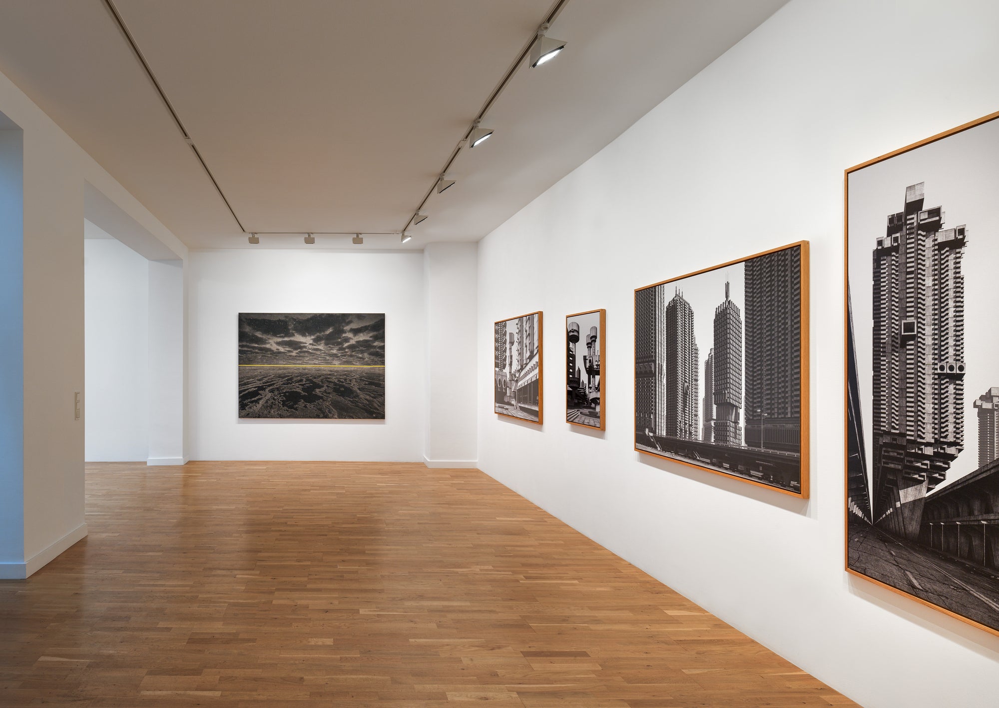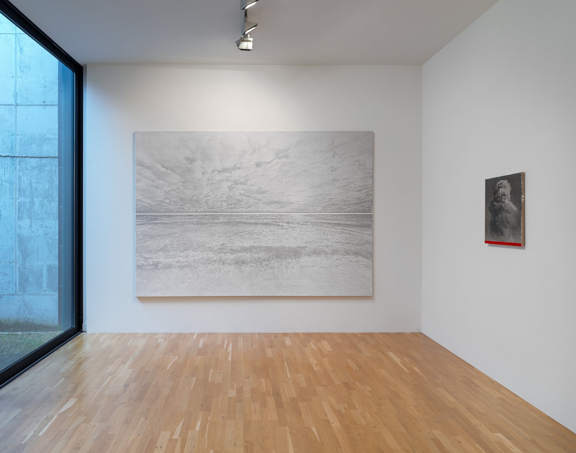 Peter Ruehle’s liminal compositions evoke traditional ideas of landscape—the sky above, the land or sea below— only to destabilize it. The sceneries depicted are conceptual structures that play with the spectator‘s perception through the unconventional use of line. A bold horizon cutting through Ruehle’s monochromatic works distorts the panorama, intensifying the feeling of vastness and sublime detachment. Linear patterns superimposed over voluminous images of clouds create a tension between geometric abstraction and the softness of atmospheric forms. A radiant horizontal line slices through the image, so blinding that the surrounding landscape collapses into darkness— like a photograph taken against the sun, form and detail consumed by light. The composition closes in claustrophobically, and the landscape unfolds as a metaphysical space, resisting taming by the viewer’s gaze.