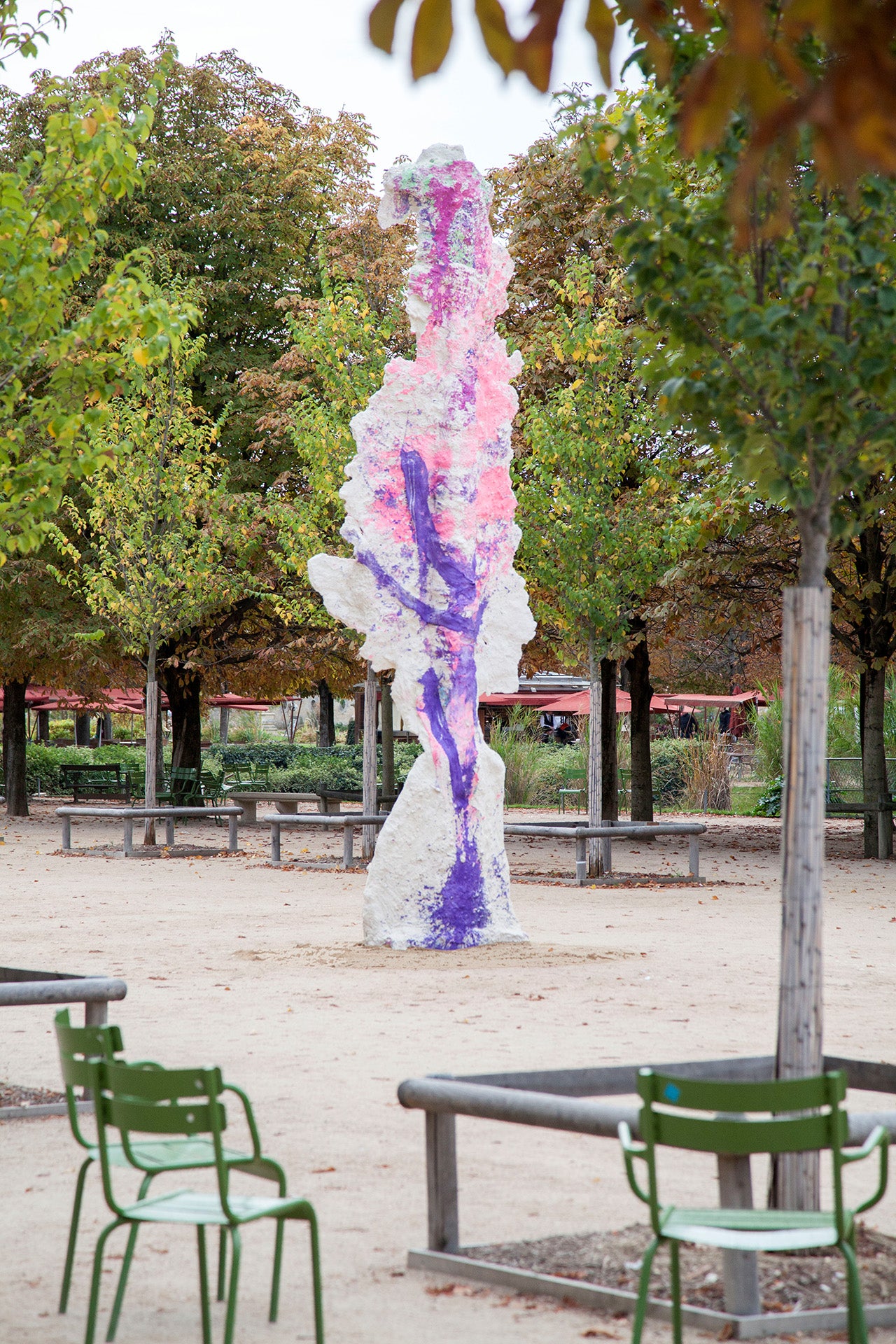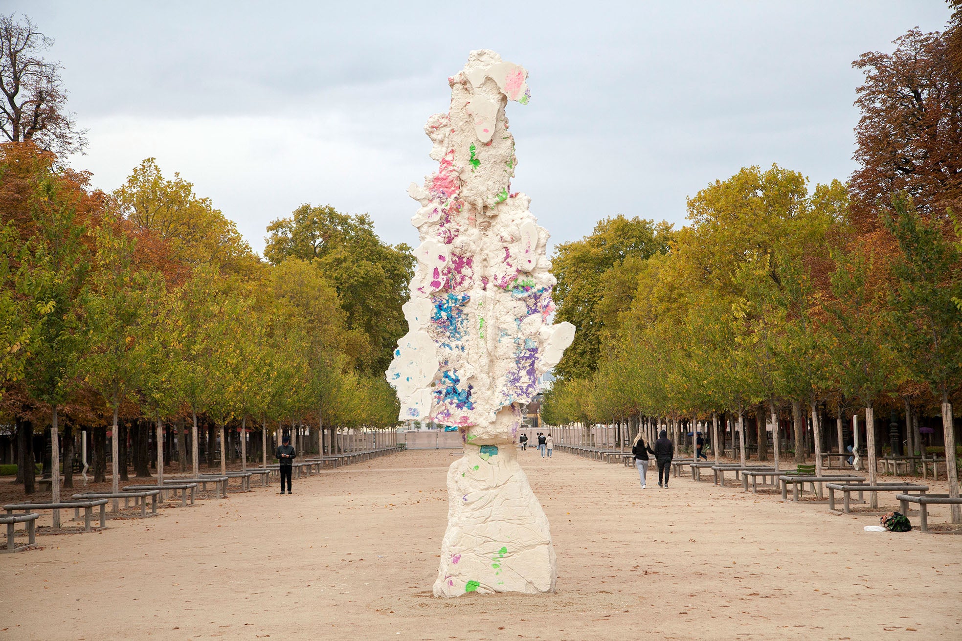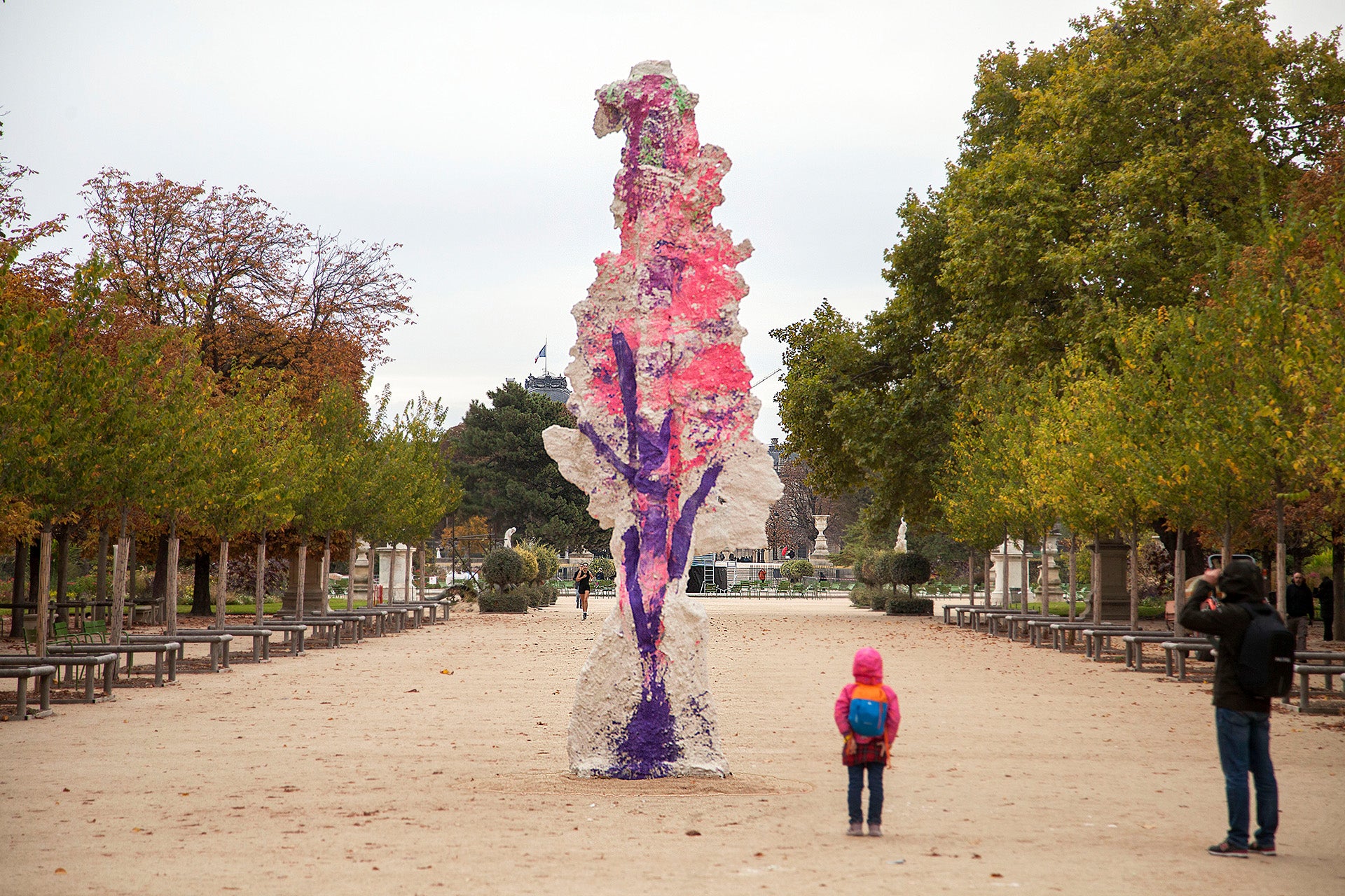 The sculpture for Jardin des Tuileries, a ‘Phoenix’, is made of white plaster and brilliant pigments, embodying the regenerative power of a mythical bird, which arises from its ashes. By using the most basic material, living matter decomposed to dust, the Phoenix was recreated on the foundations of what once was.